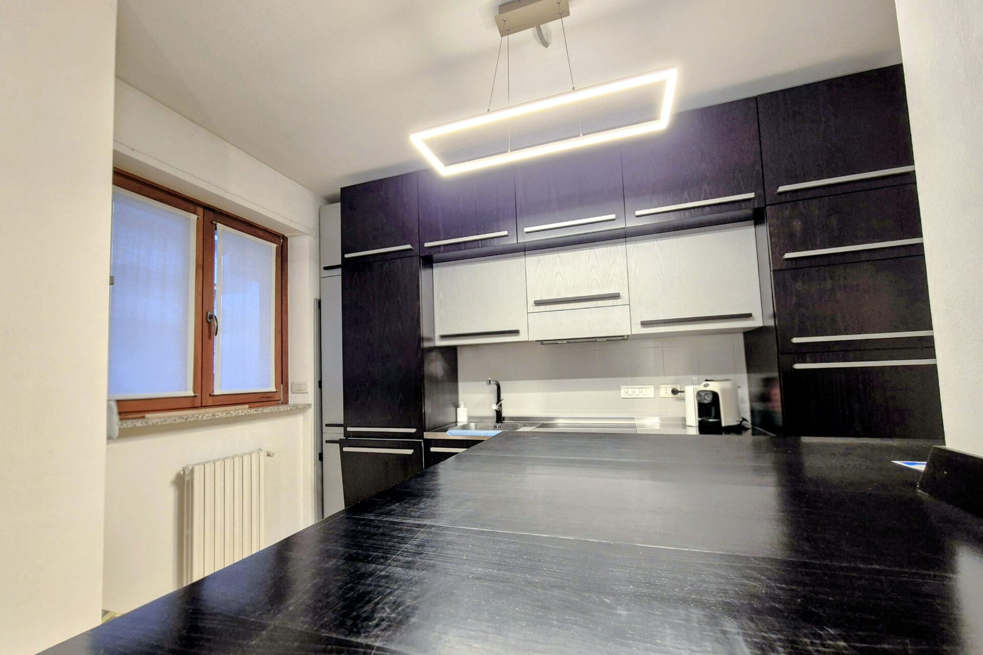 Zona Giorno composta da ingresso su un’accogliente e luminosa area living con cucina a vista, realizzata su misura e completa di tutti i principali elettrodomestici.